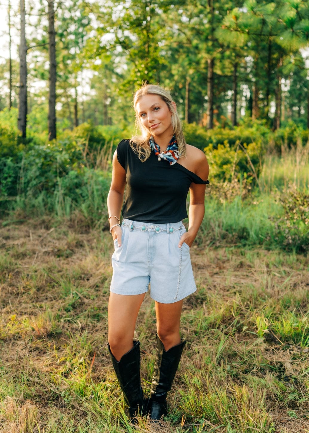 Elevate your style with our chic Black Twist Draped Shoulder Top. Its twist detail and asymmetrical design add a unique touch. while the soft and stretchy fabric provides maximum comfort. A must-have for any wardrobe. this top will make you stand out in any occasion!