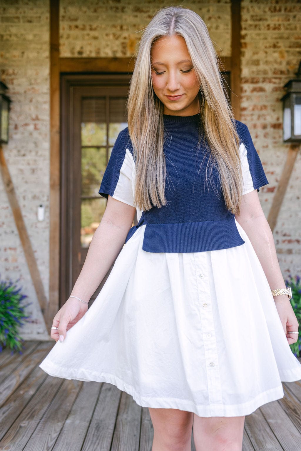 Elevate your wardrobe with our Navy Knit Detail Button Down Dress! This elegant dress features a navy knit detail and white button up design. perfect for any occasion. With short sleeves. a rounded neckline. and tie sides. this mini dress will keep you stylish and comfortable all day long.